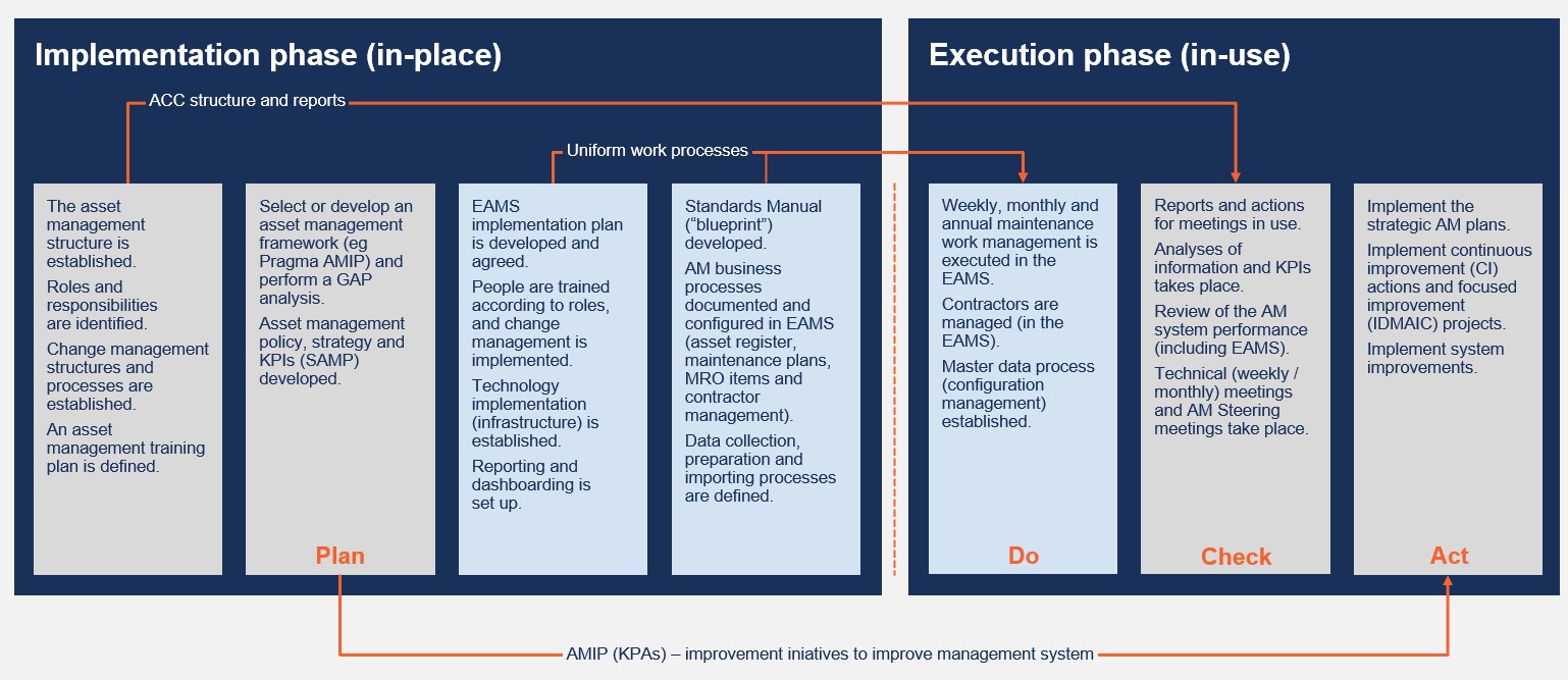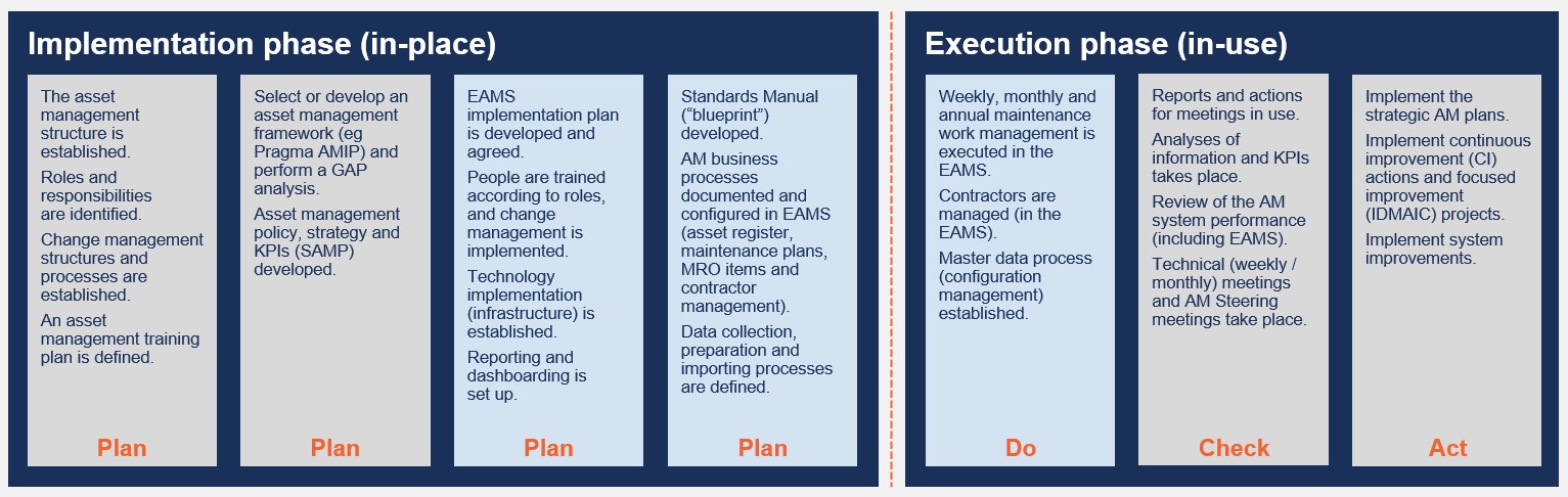 In Figure 1, we distinguish between blue and grey, where blue refers to typical EAMS-related activities and grey refers to the management processes the EAMS. The EAMS implementation often delivers a system that perfectly executes “doing” processes. However, the management processes to actively review the data and drive continuous improvement are frequently neglected or not part of the implementation.