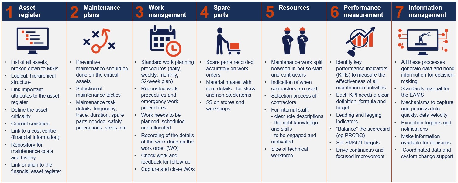 - The KPIs that will be measured by the AM structure, with their respective targets and trend requirements. These KPIs should be considered during the EAMS implementation to ensure the required data is available and the necessary reports and dashboards are configured. Often, KPIs, reports, and dashboards are configured after implementation, and as a result, the required data is unavailable, or process adjustments must be made. The initial focus should be on maintenance work management KPIs, such as backlog, schedule attainment, work distribution, top 10 downtimes, etc.