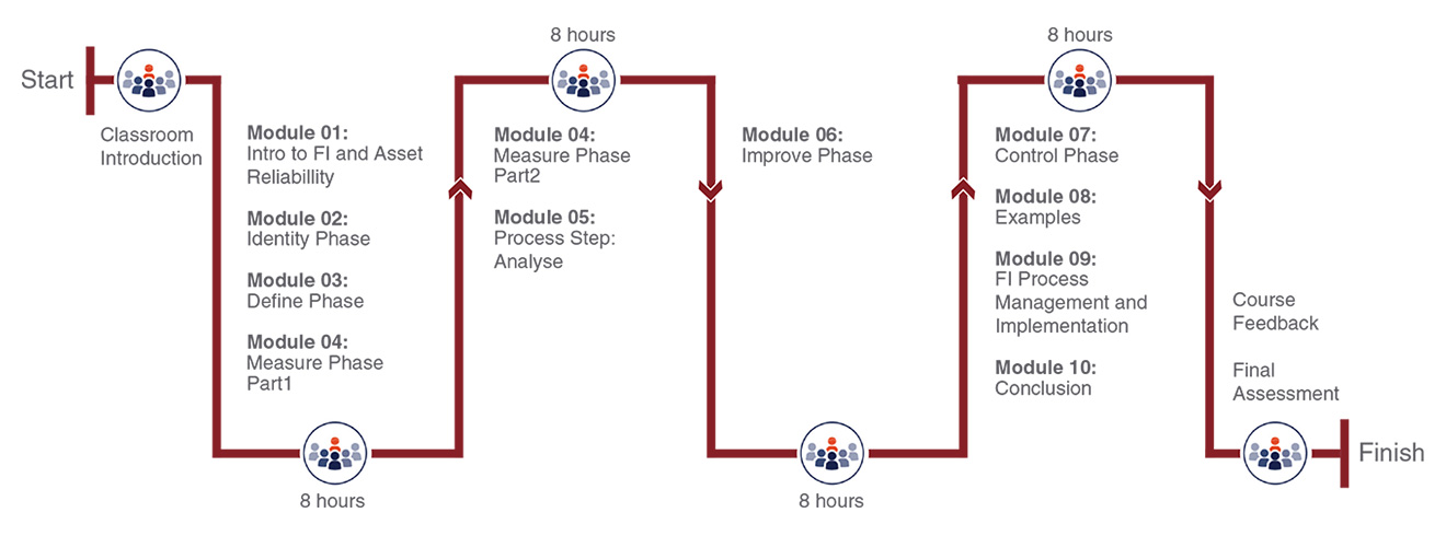The course focuses on a standardised and systematic approach known as the IDMAIC process – Identify, Define, Measure, Analyse, Improve, and Control. Unlike methodologies for process reliability, IDMAIC concentrates specifically on enhancing asset reliability.