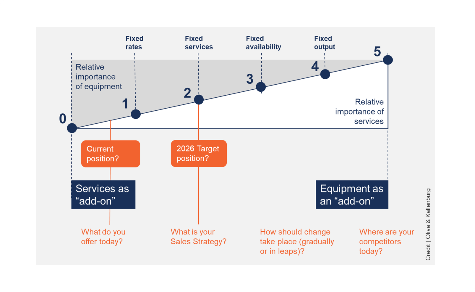 The starting point in most cases is having a clear after-sales goal related to servitisation. The model below depicts the equipment-service continuum, a progression from being an equipment-centric to a service-focused organisation. Where do you want to position yourself on this continuum in the next couple of years? Where are your competitors, and how will you differentiate yourself from them? What is the market expecting? Are you only providing equipment services at a standard rate (position 2), or guaranteeing the output from equipment (position 4)?